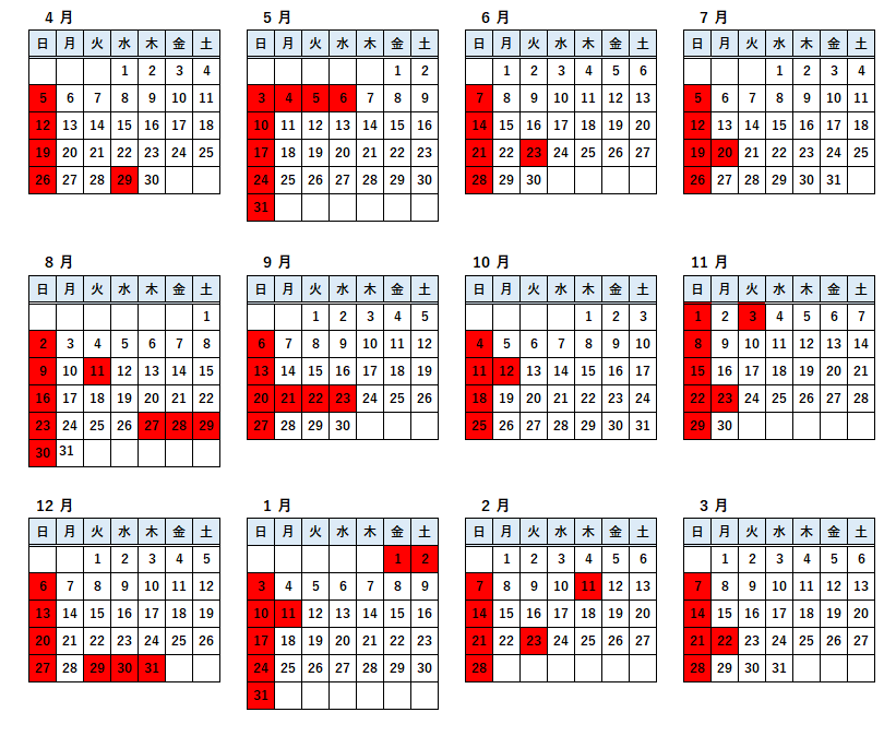 ※カレンダーの赤塗りの箇所が休日になります。